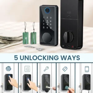 Enjoy flexible access with five unlocking options: fingerprint recognition, keypad passcode, mobile app control, traditional key, and shared access codes—perfect for front doors, bedrooms, or office spaces.